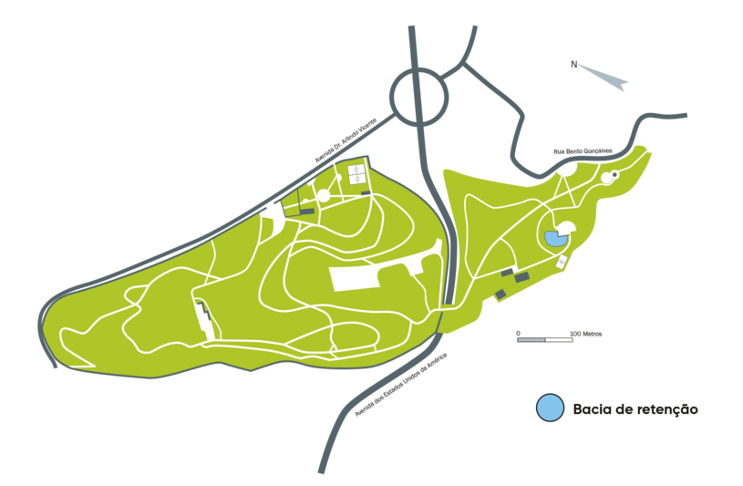 Esta ação destina-se a promover a infiltração de águas pluviais e a redução do escoamento superficial das chuvas, através da promoção de bacias de retenção em áreas verdes.